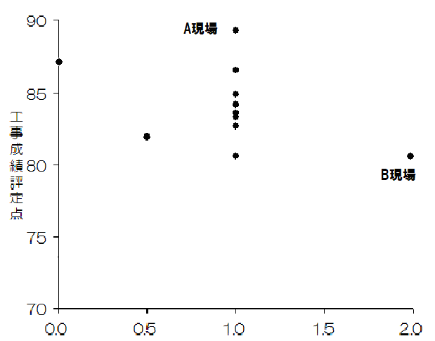 次のプロット図はある会社のものです。横軸に出来ばえの得点、縦軸に工事成績評定点をとり、それぞれの現場の位置を描いたものです。